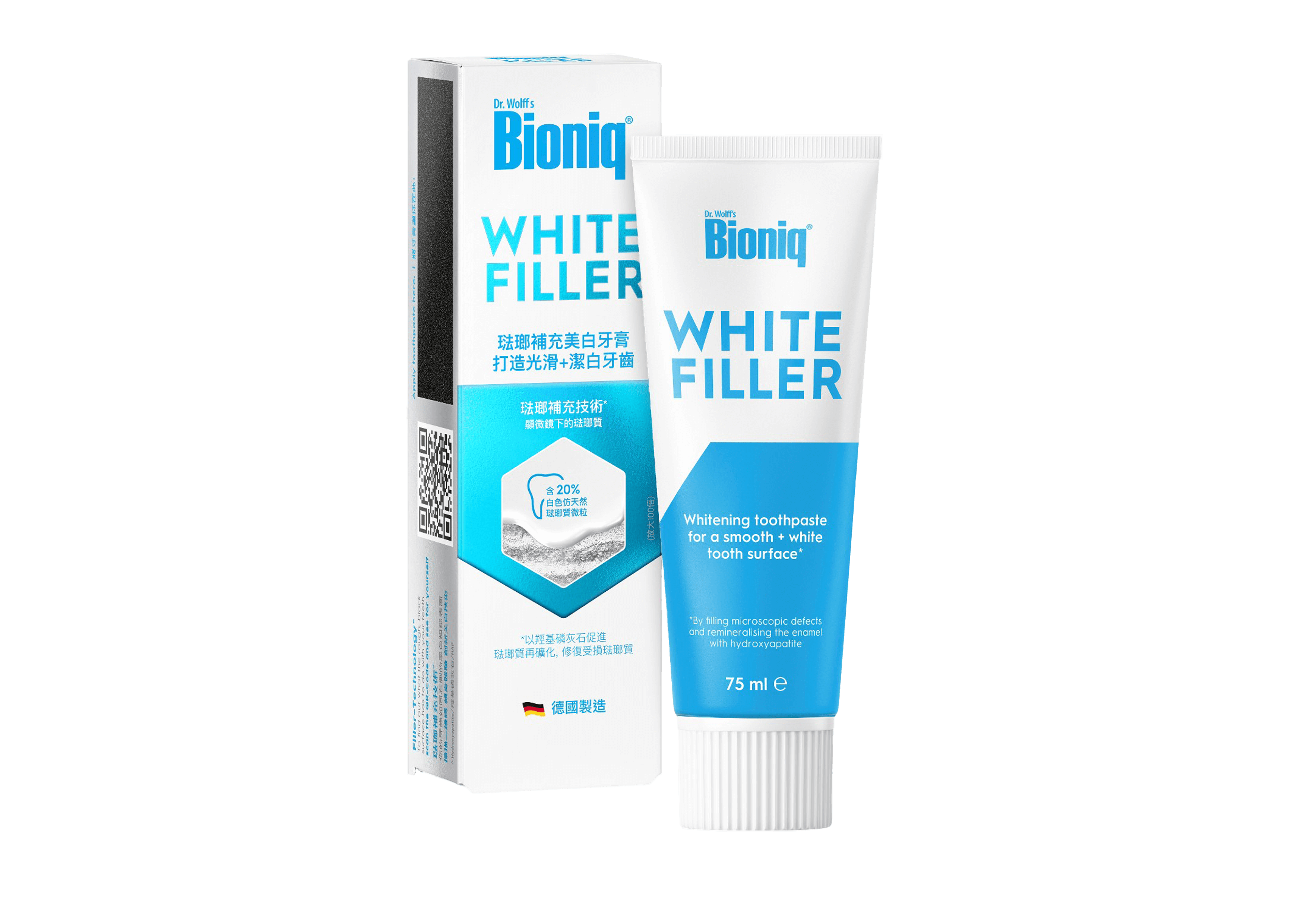 Yes, Bioniq® White Filler repairs the tooth enamel. The toothpaste gently removes discolouration and avoids particularly aggressive abrasive particles and bleaching agents.