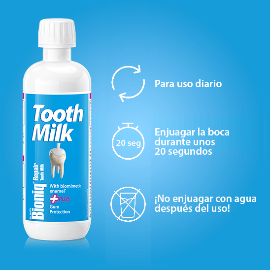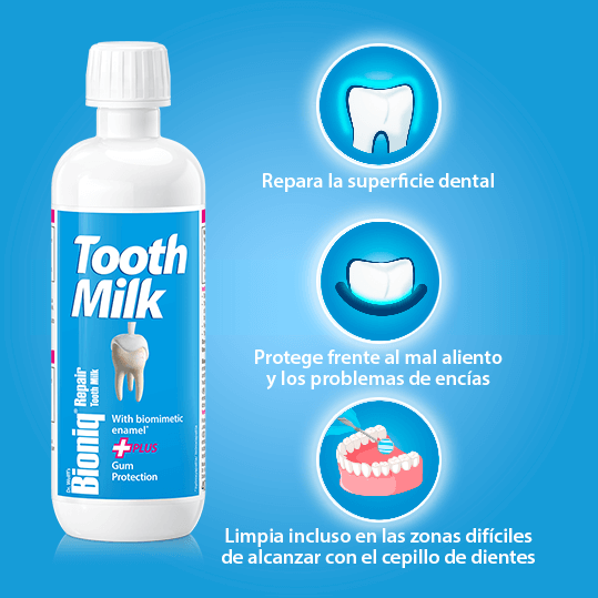La solución: Bioniq® Repair Tooth-Milk. Bioniq® Tooth-Milk reúne todas las características de un enjuague bucal convencional: